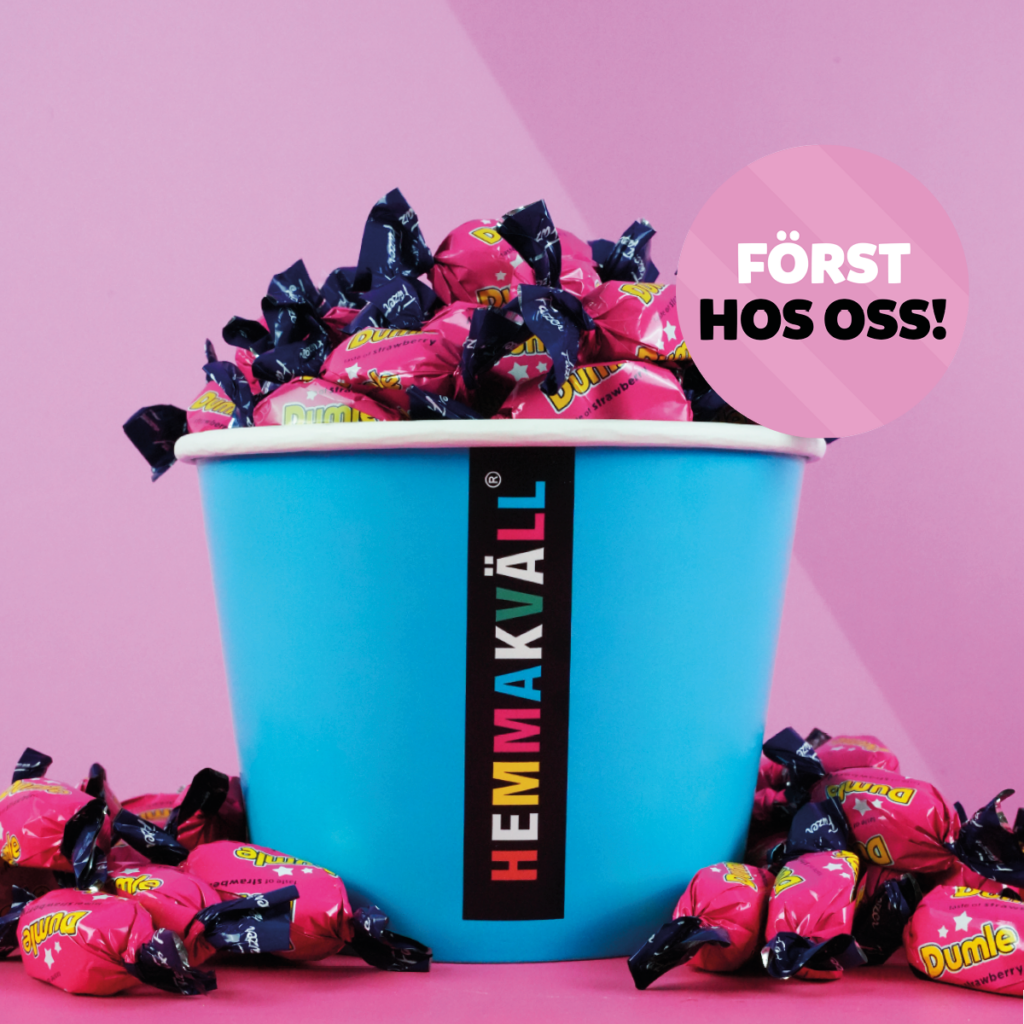 Dumle jordgubb är först hos Hemmakväll och kommer till lösvikten 27/2. Den klassiska Dumlekolan har fått en ny smak, denna gång jordgubb. Mjuk kola och Fazer choklad med smak av jordgubb, en perfekt kombination. Dumle jordgubb är gelatinfri och fri från palmolja.